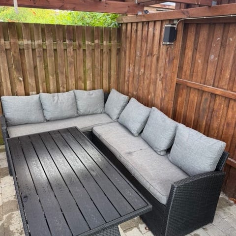 Meget solidt Havehjørnesofa med bord i grå flet med grålige hynder. Hjørnesofaen består af flere moduler, der tilsammen danner en vinkelopstilling med plads til flere personer. Sofaen har høje ryglæn og tykke, polstrede sæde- og ryghynder i lys grå. Bordet er rektangulært med matchende grå fletstel og plade med brædde-look. Fremstår med brugsspor hvilket prisen også afspejler. Sættet er købt i jysk - hedder TAMBOHUSE . Ny pris i dag er 20.000kr.
