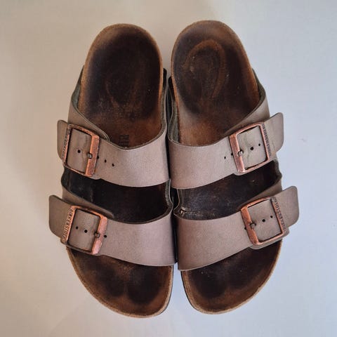 Arizona Birkenstock sandaler i størrelse 36. Modellen har to justerbare remme med spænder og klassisk Birkenstock-fodseng. Farven er sort, og sålen er mønstret for bedre fodfæste.
