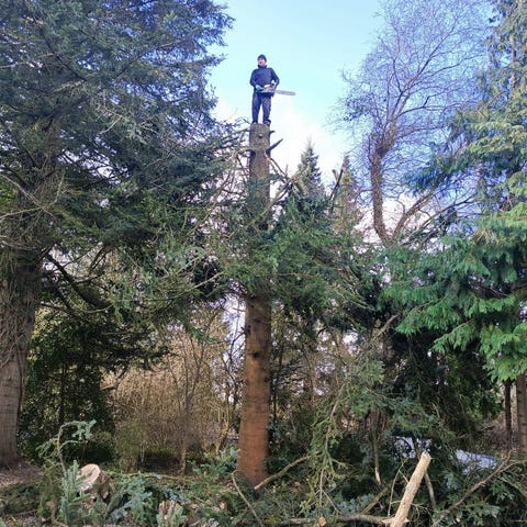 Brænde af bøgetræ (bunke) og cyprestræ (stakket) i blandede længder og diametre. Stammer og grene er skåret i 25-30 cm stykker, som kan anvendes til brændeovn, pejs eller bålsted efter eventuel yderligere opsavning og kløvning efter behov. Afhentes som uspecificeret blanding af stykker som vist på billederne. Anslås 1-2 rummeter.