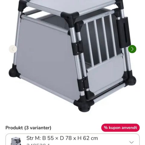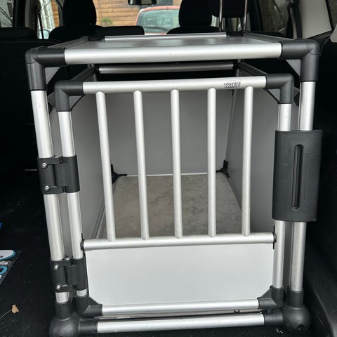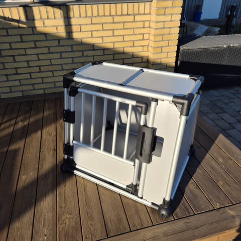 Hundebur i Golden Retriever størrelse. Buret har gitterdør foran med låsemekanisme og skrå bagkant, som er egnet til montering i bilens bagagerum. Konstruktionen består af aluminiumsprofiler med plast-hjørner og lukkede plader i sider, bund og top. Indvendigt er der plan bund, som kan udstyres med måtte efter behov. Velegnet til transport og sikring af hund i bil.