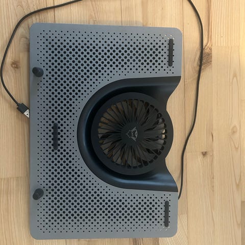 Cooler Master laptop luftkøler køleunderlag med indbygget blæser. Underlaget er beregnet til at placere under en bærbar computer for at forbedre luftcirkulationen og hjælpe med at holde computeren køligere under brug. Det tilsluttes via USB-kabel, som ses på billedet. Overfladen er perforeret for bedre luftgennemstrømning, og blæseren er placeret centralt for at dække størstedelen af bunden på en almindelig bærbar computer.
