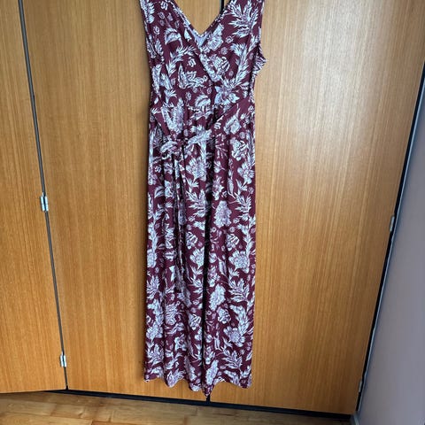 Anna Field sommerkjole i str. 42. Kjolen er fremstillet i polyester og har et multifarvet blomstret mønster på mørk bund. Ærmeløs model med elastik i taljen og knudedetalje ved halsudskæringen. Velegnet som let sommerkjole til hverdagsbrug eller ferie. Blev brugt 3-4 gange sidste sommer. Længden er 150 cm og kan sendes