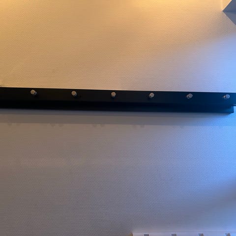 Skagerak knagerække til vægmontering. Modellen fremstår som en lang, sort skinne med flere faste knager i metal. Egnet til ophæng af overtøj, tasker eller tilbehør i entré, gang eller andre rum, hvor der er behov for ekstra ophængsplads.