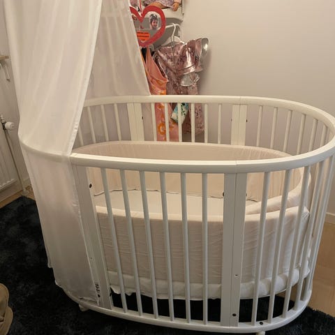 Stokke tremmeseng i naturfarvet træ. Sengen består af en oval ramme med tremmer og bundplader med ventilationshuller. Konstruktionen er i massivt træ med afrundede kanter. Produktet er mærket med europæiske standarder EN716/1996 og EN1130/1996. Egnet som babyseng/tremmeseng til spædbørn i den periode, hvor barnet endnu ikke kan sidde, knæle eller stå selv, i overensstemmelse med advarslen på produktet.