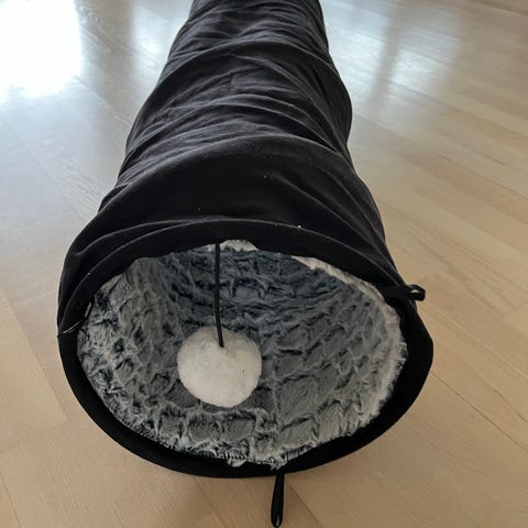Kattetunnel og kattehule i stof. Sættet består af en blød kattetunnel i mønstret stof med åbning i siden samt en rund kattehule i gråt filt-lignende materiale med indgang i siden. Egnet som gemmested og hvileplads til kat. Kan placeres på gulv i stue, gang eller andre opholdsrum.