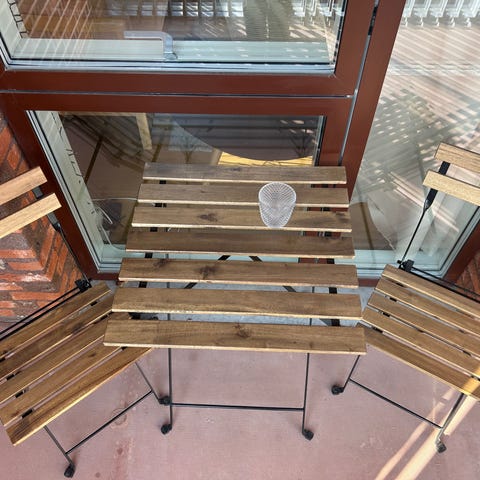 Have-/altansæt bestående af et firkantet bord og to klapstole. Sættet er i sort med stel i metal og sæde/ryg i netstof på stolene. Bordet har bordplade i træ på sort stel. Velegnet til altan, terrasse eller mindre uderum.