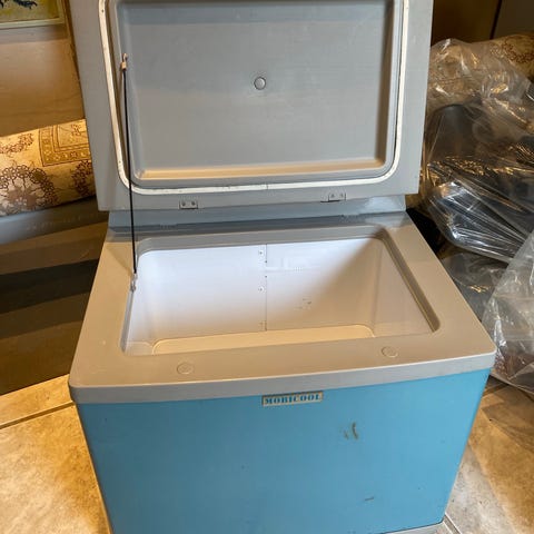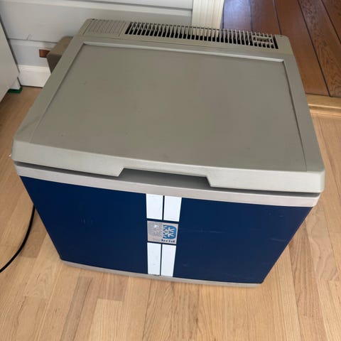 Waeco køleboks i grå plast med medfølgende strømforsyning. Boksen har indvendige rumdelere, der kan flyttes eller tages ud efter behov. Låget har integreret ventilationsgitter og kabelgennemføring. Velegnet til brug i bil, campingvogn eller som ekstra køleopbevaring på ture, hvor der er adgang til strøm.
