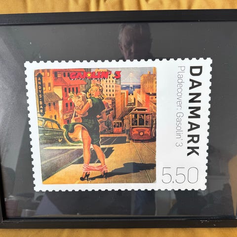 Flot og iøjnefaldende plakat med motiv fra det ikoniske Gasolin’ 3 album, gengivet som dansk frimærke-design.