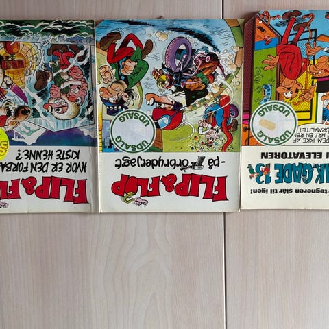 Flip & Flop, 12 hæfter, halvdelen med løse sider som serien har for vane. Nr. 2 ingen løse sider men et enkelt riv på forsiden. Alle hæfter komplette og læseværdige, enkelte med slidte rygge som på foto.