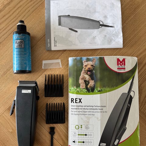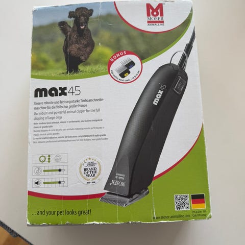 Moser max45 hundeklipper. Ledningsdrevet klippemaskine til hunde med udskiftelige skær. Flere forskellige skær og afstandskamme, som kan bruges til at variere klippelængden. Egnet til pelspleje af hunde i forskellige størrelser og pelstype. Ikke brugt meget.
