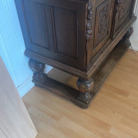 Træskab med to klaplåger i brunlakeret træ. Skabet har udskårne fyldninger på lågerne og metalbeslag ved hængsler og lukketøj. Indvendigt er der et øvre rum bag den øverste klap og et større opbevaringsrum bag den nederste klap. Egnet til opbevaring i for eksempel entré, stue eller værksted. Står på korte ben, så skabet er hævet lidt fra gulvet.