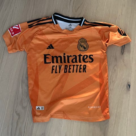 Adidas Real Madrid fodboldtrøje i hvid med gule og sorte detaljer. Trøjen har klublogo på brystet, Adidas-logo samt sponsortryk på fronten. På ryggen står der ARDA GÜLER og nummer 24. Klassisk rund hals med kontrastkant og striber på skuldrene. Egnet til brug som fodboldtrøje eller som del af fritidstøj for fans af klubben.