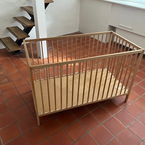 Fin tremmeseng i lys træ. Synlige brugsspor men ganske funktionel.