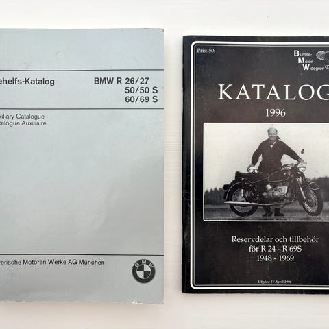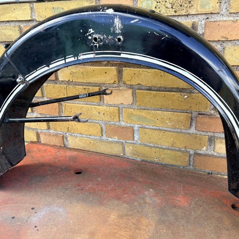 2 forskærme til BMW motorcykler. Den ene er nærmest i fabriksny stand, har formentlig bare ligget på lager, fremstår med original lak fra fabrikken med de karakteristiske håndmalede hvide stafferinger. Den er blevet solgt fra flere tyske forhandlere som passende til R50/2, R60/2 og R69S og har den rigtige bøjle nittet på fra fabrikken, men den ligner mere 19" end 18". Sælges for 1.800 kr.