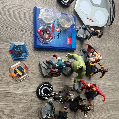 Disney Infinity spil og figurer til Playstation 4. Sættet omfatter et Playstation 4-spil samt flere fysiske Disney Infinity-figurer og brikker,