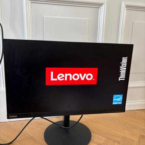 Lenovo ThinkVision skærm på 24" i sort. Skærmen står på en rund fod og har justerbart stativ.