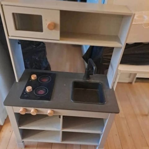 Køkkenet har brugsspor og trænger til en rengøring (vask mangler), men fungerer som det skal og har masser af leg tilbage i sig.