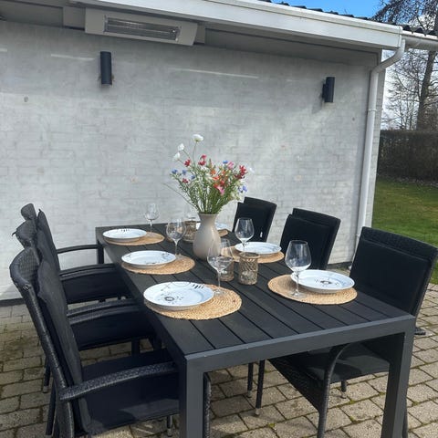 Havebordet har et sort pulverlakeret aluminiumsstel og 3 grå keramiske plader.