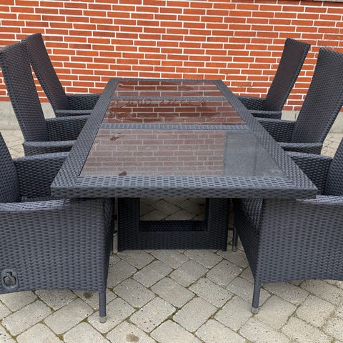 Stolene er fremstillet i kraftig grå polyrattan og har trinløs indstilling af ryggen.