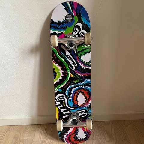 Enuff skateboard med graffiti-inspireret design i pink og grønne nuancer. Brættet har klassiske aluminium trucks og lilla hjul. Velegnet til almindelig kørsel og tricks i skatepark eller på gaden. Designet passer til både børn, unge og voksne afhængigt af højde og niveau.