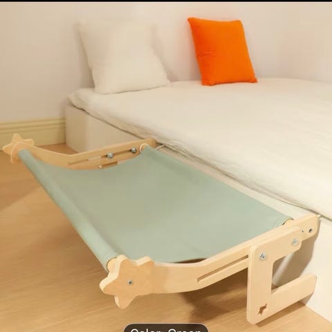 Længde stativ 73 cm. Hængekøje 50x30 cm. Stoffet er leopardmønstret på den ene side og beige på den anden side - vendbar