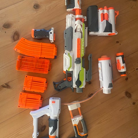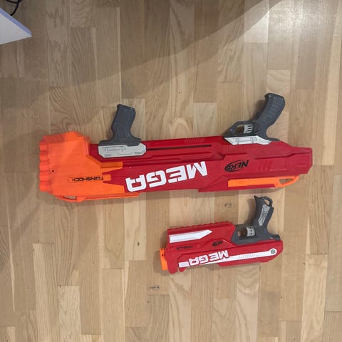 Nerf Mega legetøjsvåben sæt i rød farve. Sættet omfatter flere Nerf Mega blastere og bue samt tilhørende Mega-skumprojektiler. Egnet som legetøj til skudlege og målskydning. Designet til brug med Nerf Mega-pile i standardstørrelse.