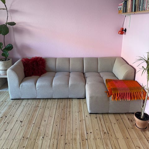 3 personers sofa m chaiselong. Den har en Lille skade i stoffet, der kan ses på en af billederne. Der er plads til opbevaring i chaiselongen. Sofaen er fra mærket Sit’n Sleep. sofaen er 2,70 m lang og chaiselong 1,60 m lang😊