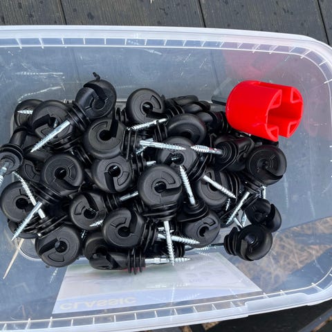 Helt ny rulle Star hegstråd, samt andre ruller med hegnstråd i forskellige tykkelser og længder. Omkring 20 brugte men fuldt funktionsdygtige håndtag samt 4 helt nye. ca. 2/3 del fyldt kasse med isolatorer, nogle brugte andre helt nye. Spand med spænder og småbeslag til montering på pæle, samt en pose klemmer til at fastgøre tråden på fx. Håndtag. Der er også en lille rulle elastik hegn til ledåbninger.