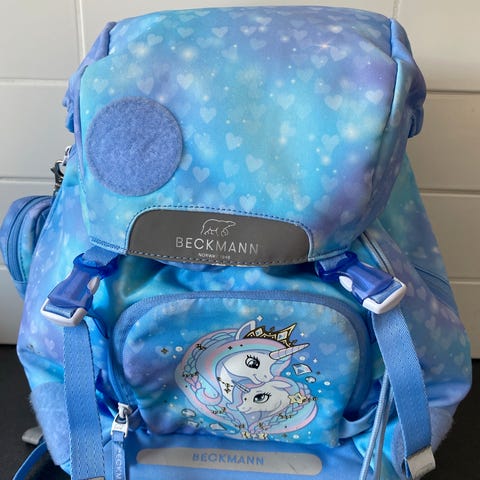 Beckmann skoletaske og gymnastiktaske samt penalhus med enhjørning i flerfarvet pastelprint. Skoletasken har polstrede, justerbare skulderstropper, brystrem og polstret rygpanel. Den har flere rum, herunder stort hovedrum, frontlomme med enhjørningemotiv og sidelommer. Gymnastiktasken har samme design med enhjørning på fronten og justerbare stropper. Begge dele er velegnede til skolebrug for børn.