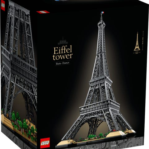 LEGO Icons Eiffel Tower 10307 + Game of Bricks lyskit Rc. Indeholder byggevejledninger og originale emballager. Står samlet i sektioner. Lys kit delvist monteret på base og nedre sektioner. Egnet til LEGO-samlere og modelbygning som udstillingsmodel i hjemmet.