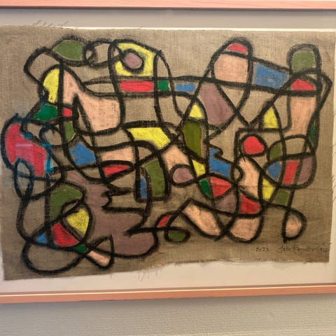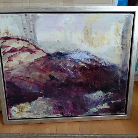 Kunstværk af Julie Pons, 2017, abstrakt. Oilstick. Monteret på syrefri hvidt bagpapir med syrefri tape. Valnøddefiner boxramme. Ramme måler 69,5*89,5 cm. Selve kunstværket måler 57*76 cm.