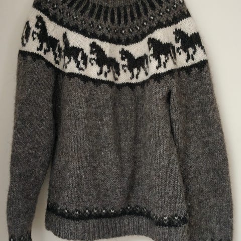 Trøjen er i hvid uld med mønsterstrik i kontrastfarver. Den har høj hals og ribkanter ved hals, ærmer og bund. Velegnet som varm overdel i kølige perioder og kan bruges både alene eller over en T-shirt eller skjorte.