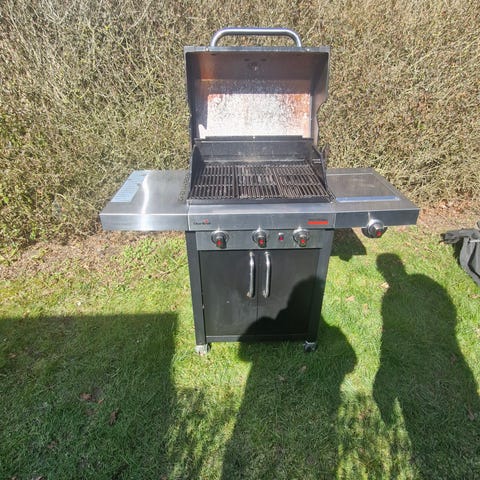 Char‑Broil Professional gasgrill 5 år gammel med 4 brændere og 1 sidebrænder, alt virker. Grillen har låg med indbygget termometer, stor grillrist i støbejern samt varmholdningsrist i stål. Arbejdsflader i rustfrit stål på begge sider giver plads til forberedelse af mad. Under grillen er der skab med dobbeltlåger til opbevaring af gasflaske og grilltilbehør. Grillen er udstyret med hjul. Overtræk medfølger.