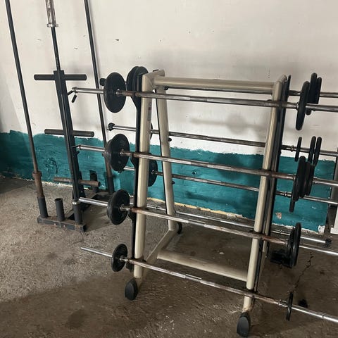 Racket er i sort metal og har ekstra ben til fuld stabilitet ved selv de helt tunge håndvægte. Det står i en rigtig god stand.