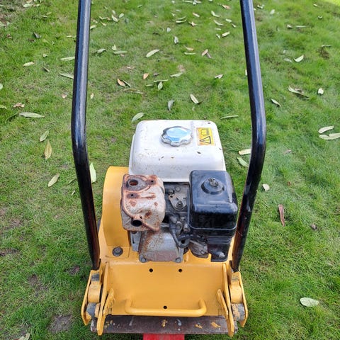 Pladevibrator til komprimering af jord, sand og grus. Benzinmotor med håndtag til styring under arbejdet. Maskinen har gul bundplade og er egnet til mindre anlægs- og belægningsopgaver, f.eks. forberedelse til flisebelægning, indkørsler og stier.