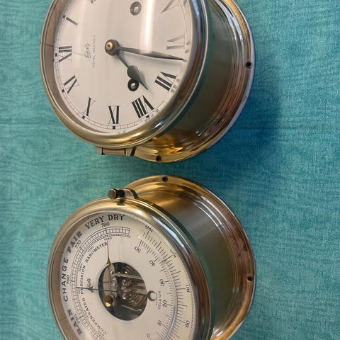 Royal vægur og barometer i messing. Sættet består af et vægur med romertal på hvid urskive samt et barometer med hvid skive og trykangivelser. Begge dele er udført i messingfarvet metal med rund form og kan monteres på væg. Egnede til indendørs brug som tids- og vejrinstrumenter.