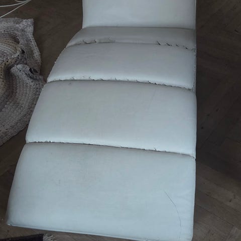 4 teak lænestole med blåt kunstlæder gives væk