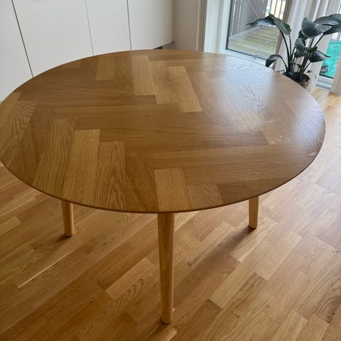 Rundt spisebord der er 140cm bredt, der kan sidde op til 8 personer omkring det.