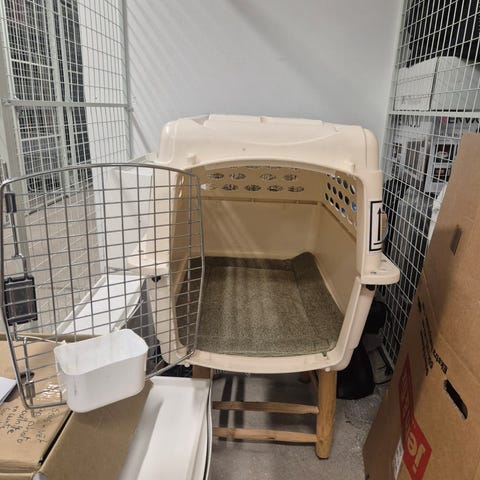 Kassen er lavet af kraftig plast med metalgitterdør og sikkerhedslåse.