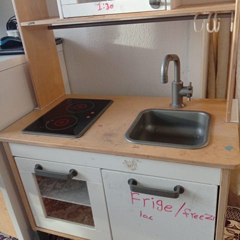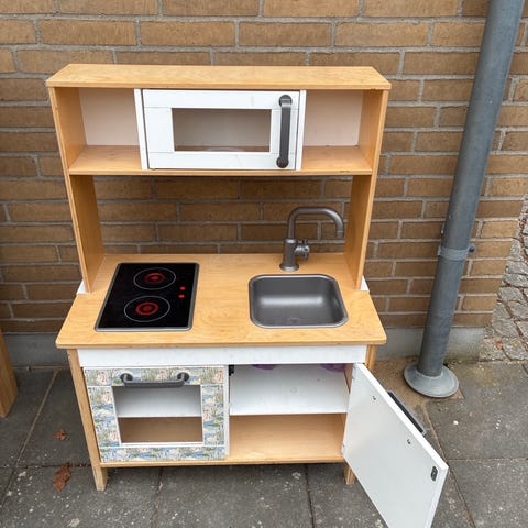 legekøkken i hvid. Består af køkkenmodul med kogeplader, ovn, vask med armatur og opbevaringsskab samt tilhørende høj køleskabs-/fryserenhed. Egnet til leg i børneværelse eller legeområde og giver mulighed for rolleleg omkring madlavning og køkkenaktiviteter.