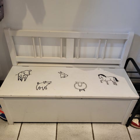 børnebænk med opbevaring i hvidmalet træ. Bænken har ryglæn og sædelåg, der kan løftes op for adgang til opbevaringsrummet under sædet. Velegnet til brug på børneværelset til opbevaring af legetøj, bøger eller andre mindre ting samt som siddeplads for børn.