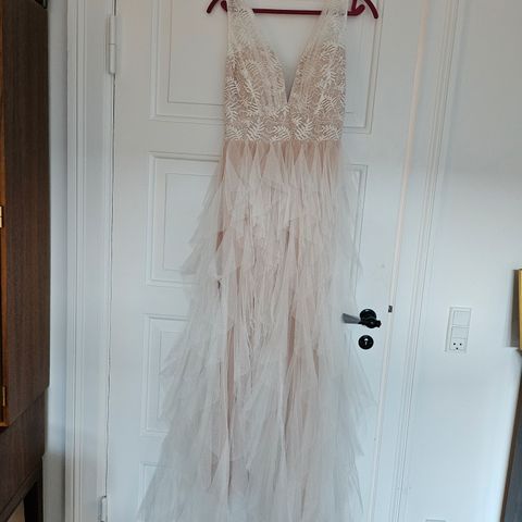 Købt brugt. Kjolen blev renset efter brug, men har siden hængt i skabet, hvorfor den ikke fremstår som nyrenset nu. Kommer i stofpose.