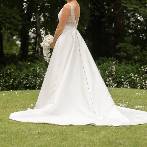 Kjolen er lagt op, så den er uden slæb. Da slæbet blev fjernet, er tyl-stylingen i den ene side tilpasset denne længde, mens tyl-stylingen i den anden side har beholdt sin oprindelige længde. Der er en lille skade i tyllet nederst, se billede.