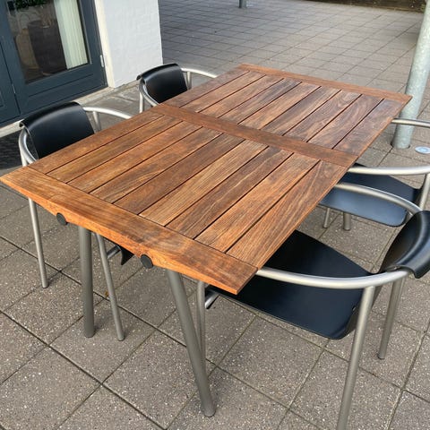 Sættet består af bord, bænk og 2 stole, som vist på billederne.
