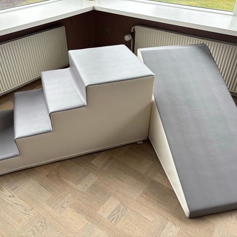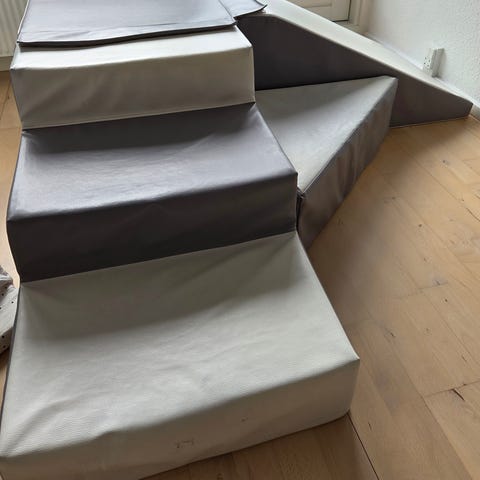 Rutsjebane legesæt i blødt skum til børn i beige farve. Består af flere moduldele, der kan samles til en lille trappe eller skrå ramper. Fremstillet i blødt skum med glat overflade, egnet til indendørs brug på gulv. Kan anvendes til motorikleg, kravle- og klatreøvelser for mindre børn. De enkelte elementer kan flyttes og kombineres efter behov for at skabe forskellige lege- og træningsmiljøer.