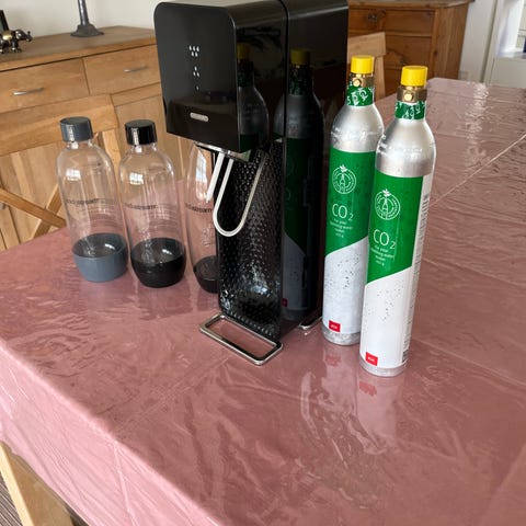Sodastream med 1 næsten fyldt gasflaske, og en alm flaske..