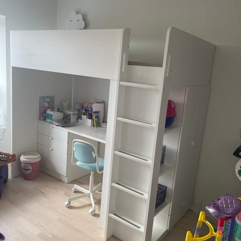 Højseng til børn i hvid med integreret opbevaring og skrivebord. Sengen har indbygget reol, skabe og skuffer under liggefladen samt skrivebord. Adgang til sengen via lille stige i siden. Velegnet til børneværelse, hvor der ønskes kombination af soveplads, opbevaring og arbejdsplads i ét møbel.