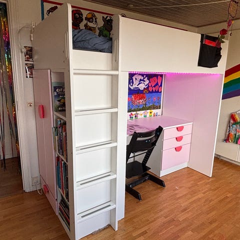 Flot Højseng til børn med opbevaring og skrivebord hvid