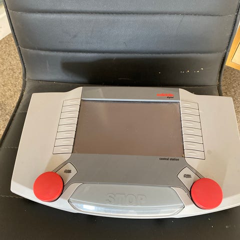 Märklin Central Station digital styreenhed til modeltog. Enheden har stort farvedisplay, to drejehjul til regulering af tog, funktionsknapper i siderne samt STOP-knap på fronten. Velegnet som central digital kontrol til styring af flere lokomotiver og funktioner på et Märklin modelbaneanlæg.