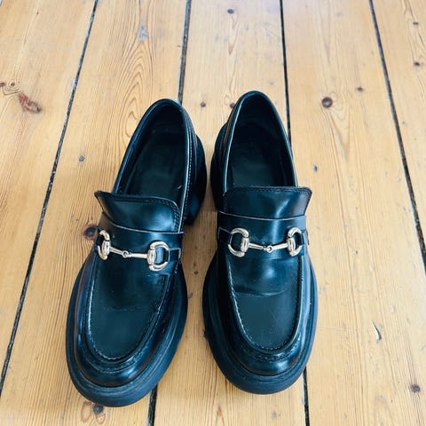 H&M loafers dame sko i størrelse 36. Skoene er sorte med blank overflade og kraftig, mønstret sål. Klassisk loafer-design med rund snude og påsyet rem over forfoden. Velegnet til hverdagsbrug og som en enkel, klassisk sko til både bukser og kjoler.